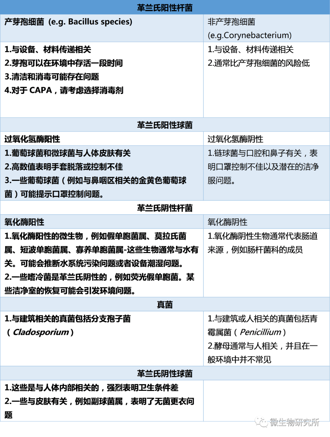 微生物鉴定方法在引入实验室之前的验证是非常有必要的。例如通常要包括代表性的参考微生物进行验证,人员的重复性以及不同实验室之间的比较。使用自动化系统降低了进行微生物鉴定所需的技能水平,但是有经验的微生物学家对结果的解释仍然很重要。一个常见的监管问题是数据审查不够充分,未能对非典型的鉴定结果提出质疑。环境里回复到炭疽芽孢杆菌时(与蜡样芽孢杆菌非常接近),制药微生物学实验室应该对这一结果提出质疑。分离到无害的生物也是如此:如果复原的生物体通常与热带昆虫有关,那么需要考虑实验室是否真的有可能回复到它?这种情况下应该启动重新鉴定。如果初始筛选操作不正确,例如革兰氏染色、鉴定试剂盒或者卡片的错误使用、过度依赖于一个单一的鉴定系统,都有可能会发生这样的问题。建立适当的区分水平是鉴定策略的重要考虑因素,这有助于微生物工作人员决定该鉴定哪些样品以及可以如何使用数据。审查结果应采取议定程序的形式,以便在实验室内建立一致的程序。如果在GMP检查期间提出问题,书面的议定程序提供了与监管机构讨论的途径。鉴定方法的选取基于微生物学家的需求。在某些情况下,知道微生物是革兰氏阳性菌就足够了。在其他情况下,微生物学家可以通过表型鉴定来了解微生物的一般情况,评估生物是否有害(不可接受)或者表示失控。在特定的情况下,例如无菌试验失败或者在无菌灌装实验和操作者之间获得明确联系的情况下,可能需要通过分子手段找到无菌试验污染物和洁净室生物之间的联系。在对微生物偏离的研究中,了解微生物的类型可以提供关于其来源的宝贵信息。例如,许多革兰氏阳性球菌是人体皮肤菌群的一部分。革兰氏阳性杆菌可以通过设备和鞋类转移到洁净区域,革兰氏阴性杆菌通常与水源相关。收集这些数据可以提供以下帮助:b)帮助进行产品安全风险评估,例如非无菌产品的潜在污染,与无菌加工区内的侵入有关的污染;然而,需要鉴定的水平(例如镜检、属或种)将根据所测位置或产品的关键程度而变化。此时,不一定都需要鉴定到种水平。例如,对于从低风险区域(例如未分类的房间和饮用水)采集的样本,可以采用简单的形态描述和革兰氏染色。以下情况需要到属或种水平的更详细的鉴定:较高风险的分离株(例如来自于原料或成品的分离株);超过行动限(定义为可能造成危害的阈值);来自于高等级洁净室的分离株(例如所有无菌灌装分离株)。通过对生物体进行简单分组,可以获得非常宝贵的信息,如下表2: